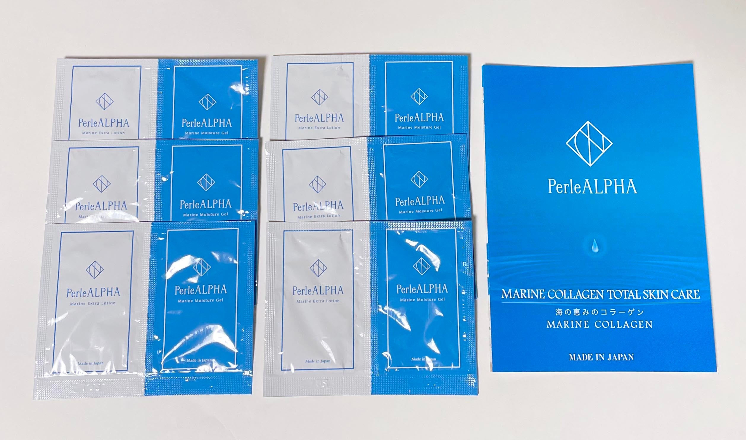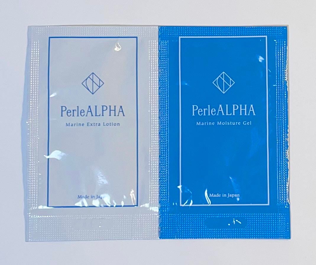 日本海に面する鳥取発のブランド・PerleALPHA(ペルルアルファ) のマリンコラーゲンの基礎化粧品、マリンモイスチャーゲルクリーム3gと マリンエクストラローション3gをセットにしました。